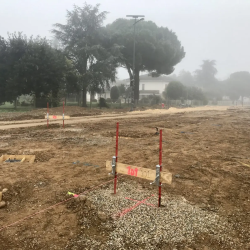 Implantation précise des fondations et points de forage, assurant alignement et conformité aux plans.